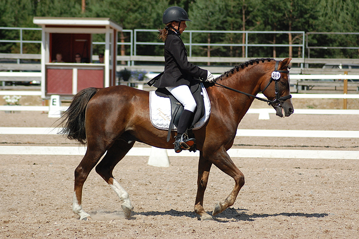 Poni taittaa kouluratsastusliikkeet helppoon A:han asti. Liikkeissään se on notkea ja kulkee mukavan pyöreänä, ravi on yllättävän tasaista ja matkaavoittavaa, samoten laukka on reipasta kuitenkaan liikaa kaahottamatta. Koska Poni on herkkä myös suustaan, ori pysähtyy reilummasta ohjasavusta kuin seinään vaikka kiitolaukasta.